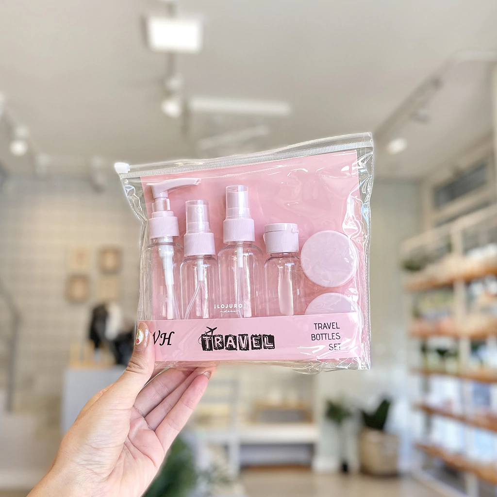 Contiene 4 envases/frascos: 1 con dispenser, 2 con atomizador, 1 con tapa (ideal cremas, aceites) + 2 frasquitos con tapa a rosa.