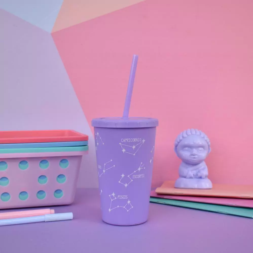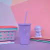 Vaso plástico en colores pasteles estampado en serigrafia blanca, con tapa encastrable y sorbete